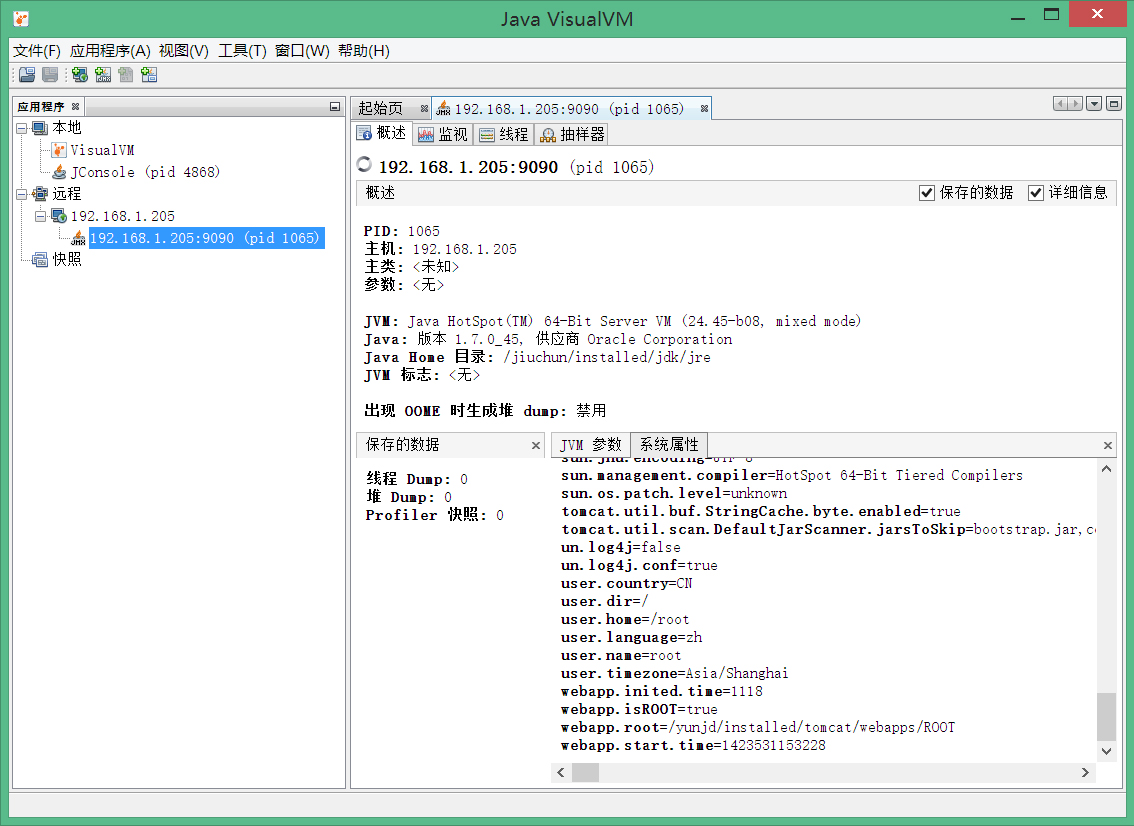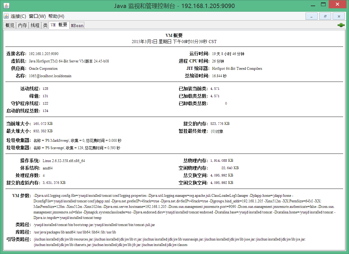 JAVA_OPTS=" -Xms512m -XX:PermSize=64M -XX:MaxPermSize=128m -Xms512m -Xmx1024m -Djdapp.home=/jdapp/home -DconfigFile=/yunjd/installed/tomcat/conf/jdapp.xml -Djava.net.preferIPv4Stack=true -Djava.net.divferIPv4Stack=true -Djgroups.bind_addr=192.168.1.35 -Djava.rmi.server.hostname=192.168.1.35 -Dcom.sun.management.jmxremote.port=9090 -Dcom.sun.management.jmxremote.authenticate=false -Dcom.sun.management.jmxremote.ssl=false -Djmagick.systemclassloader=no "
